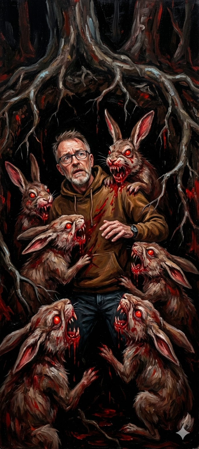 Ich habe die Gefahr in dieser Situation nicht erkannt weil die Kaninchen ständig dazwischen redeten. Keine klaren Gedanken mehr möglich. Stück für Stück. Ohne es zu bemerken haben mich die Kaninchen damit immer tiefer in Ihren Bau gezogen, aus Ihnen wurden Monster, spitze reißerische Zähne die sich in meine Seele fraßen, „Du willst doch das es auf hört oder? Oder sollen Wir weiter machen?“